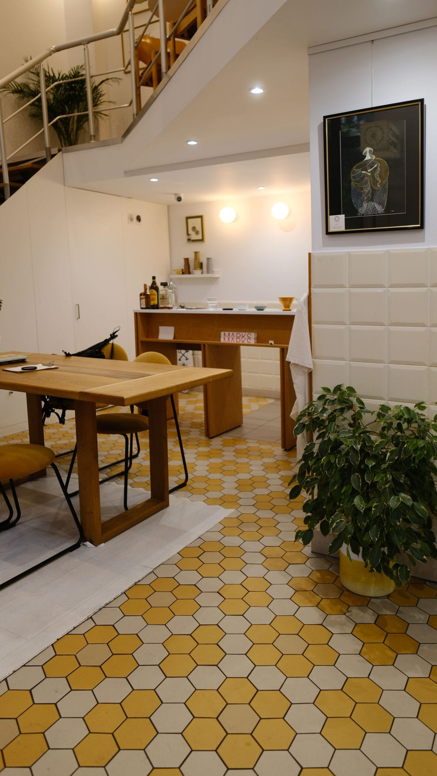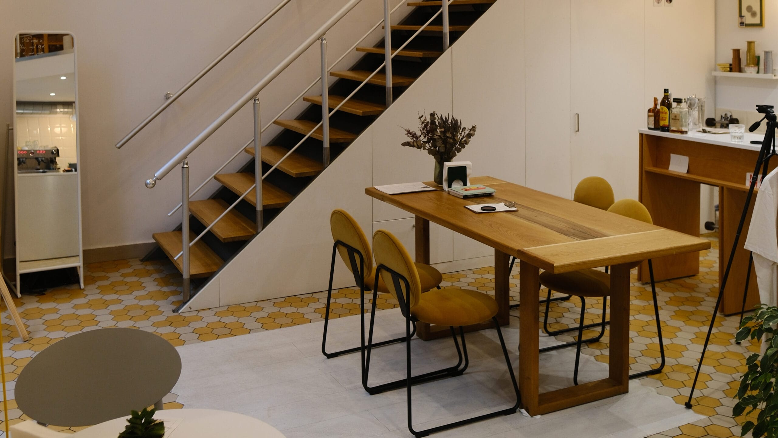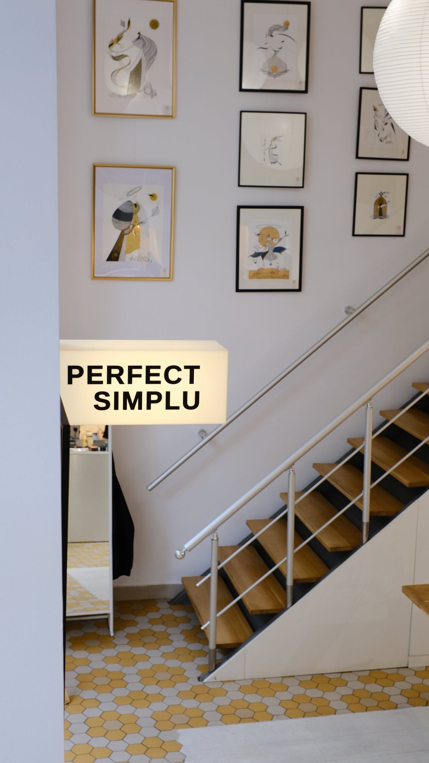 Un element distinctiv în acest proiect este caseta luminoasă amplasată pe peretele din dreapta intrării. Cu un cablu aparent îmbrăcat în textil galben, aceasta atrage atenția și este colantată cu numele cafenelei, Perfect Simplu, devenind un reper vizual pentru vizitatori. Mesele și scaunele, selectate cu atenție împreună cu proprietarul, se integrează perfect în designul general, asigurând coerența estetică și funcțională a spațiului.