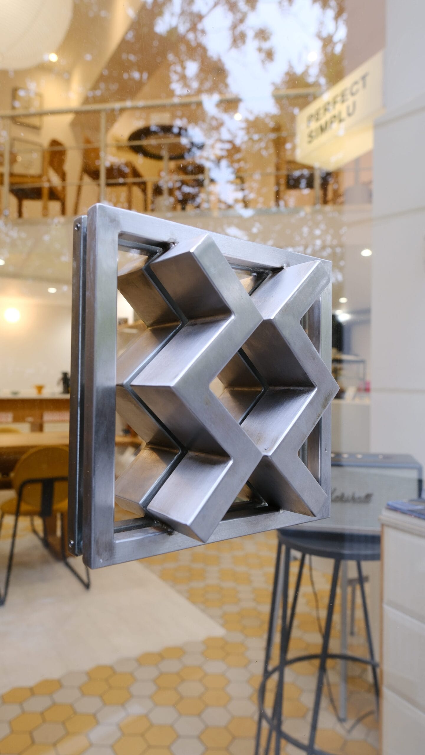 Mobilierul, realizat în principal din placaj de fag, contribuie la crearea unei atmosfere naturale și prietenoase. Dispunerea zonelor de bar, shop și brew bar a fost gândită pentru a utiliza eficient spațiul, valorificând cei doi stâlpi existenți și conturând un layout în formă de zig-zag, inspirat din logo-ul Perfect Simplu. Această formă distinctivă se regăsește și în detaliile de design, cum ar fi mânerul metalic al ușii de acces, care reflectă identitatea vizuală a brandului.
