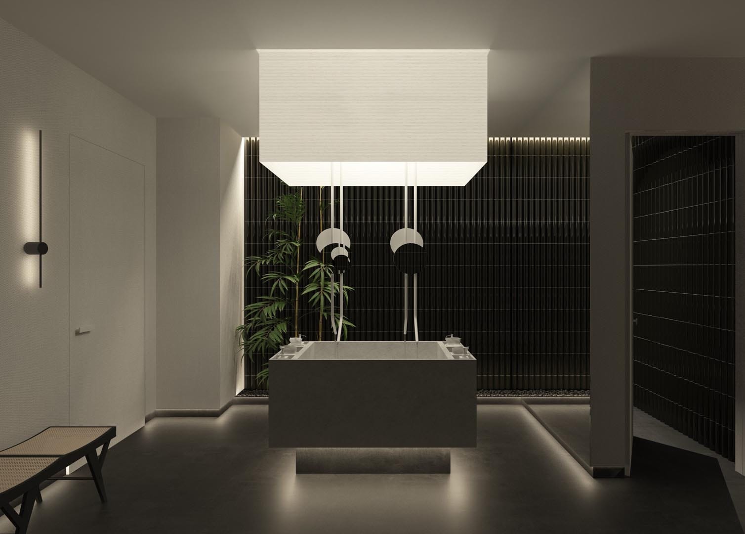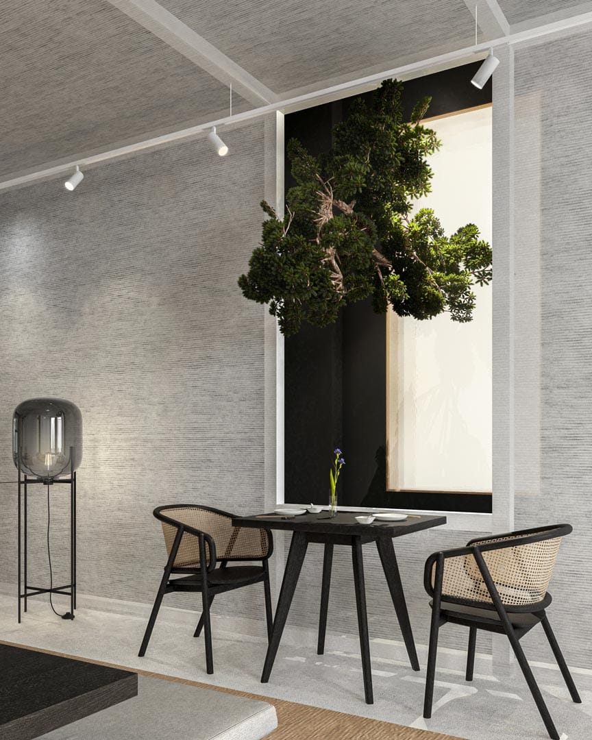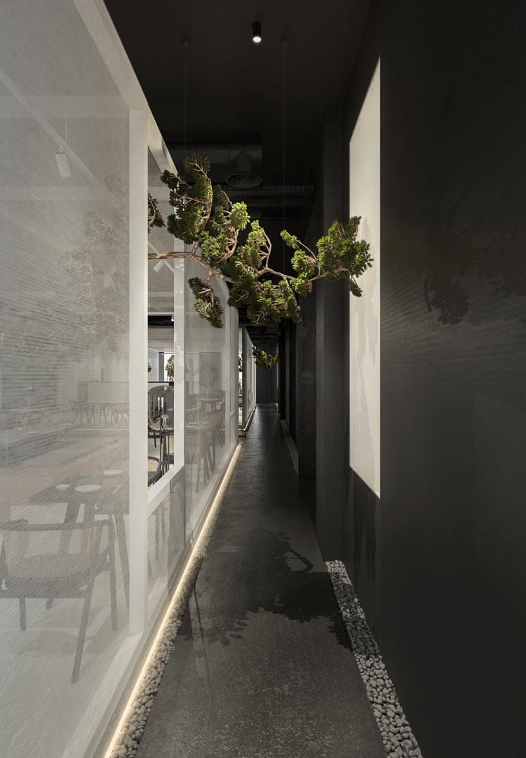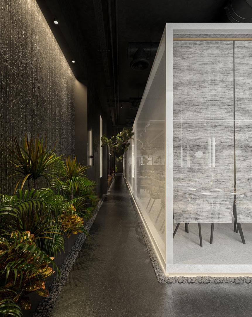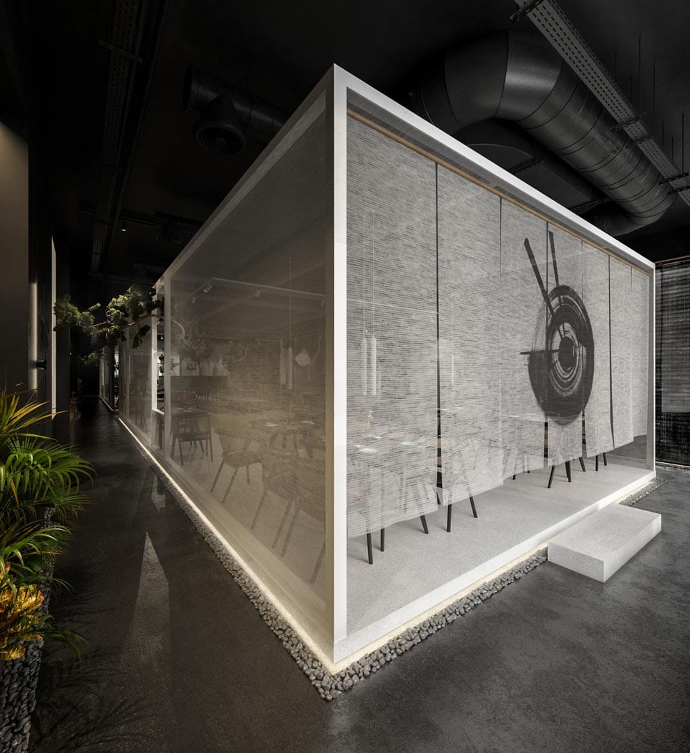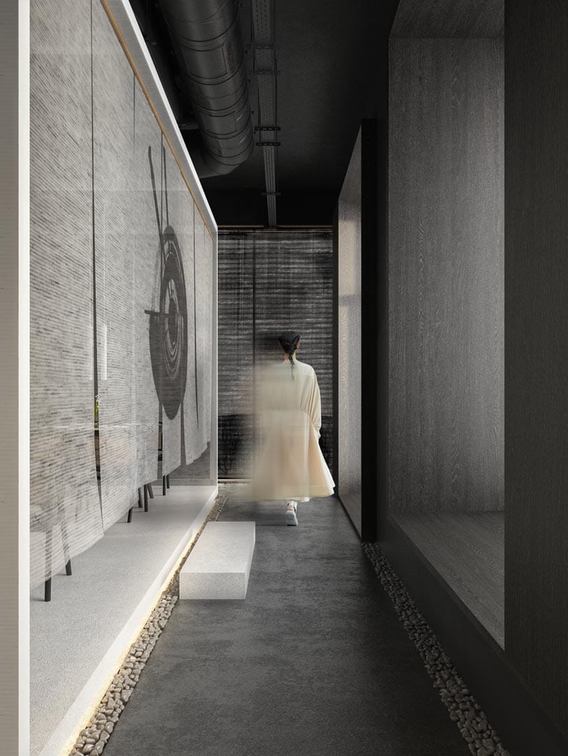 Conceptul are la bază ideea de dualitate și interconexiune prin crearea unui contrast cromatic alb-negru și unul de lumină-întuneric. Spațiul este gândit ca o parcurgere de descoperire, de accedere către interior, către sine și detașare de exterior.