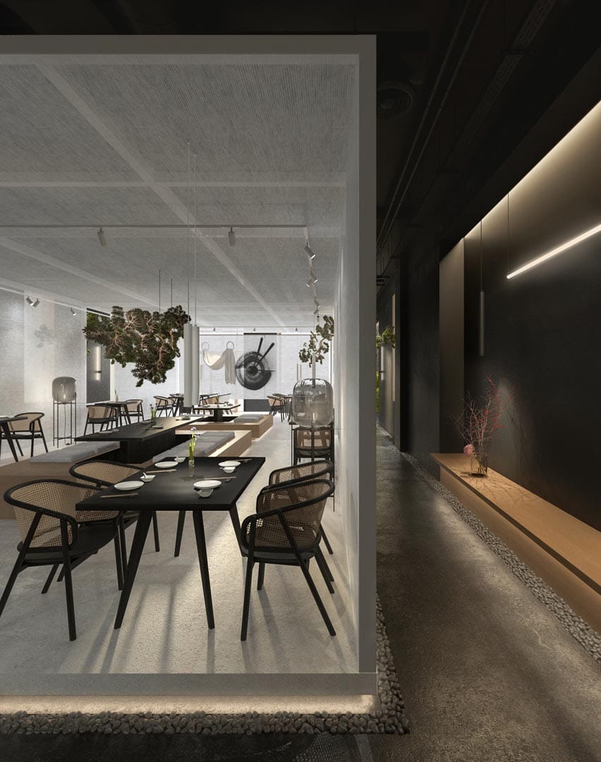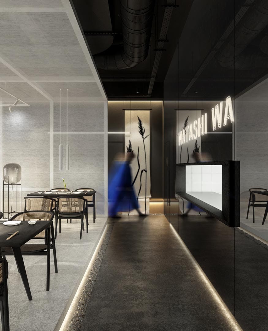 Modul de folosire al luminii, culorilor, texturilor și a dispunerii mobilierului de ședere crează o atmosferă intima, de serenitate care apropie. Asfel, zona mobilierului de ședere din spațiul capsulă nu este vizibilă publicului în momentul accesului în restaurant, acesta fiind marcat printr-o țesătură semitransparentă, numită în tradiția japoneză noren. Latura opusă intrării în capsulă se deschide către zona de bucătărie ce este evidențiată printr-o fantă destinată servirii. Peretele care separă spațiul tehnic de zona publică este placat cu oglindă ce reflectă interiorul restaurantului, creând un efect imaginar de continuitate. Plecând de la elemente tradiționale specifice amenajării asiatice am propus zone supraînălțate cu trepte de acces. Am folosit materiale naturale precum piatra pentru marcarea parcursului perimetral al spațiului, lemnul pentru mobilier, pânza pentru acoperirea structurii capsulă, vegetație și apă pentru zona holului. Un element de accent îl constituie legătură dintre zona interioară luminoasă-capsulă și zona exterioară întunecată-hol ce se face printr-un decupaj ca o fereastră, un simbol al conexiunii cu natura. Watashi Wa este un concept prin care ne-am propus ca publicul să experimenteze bucătaria asiatică într-o ambianță care să te transpună catre această regiune unde simplitatea, calmul, aromonia, echilibrul și detașarea sunt principii ce definesc un stil de viață.