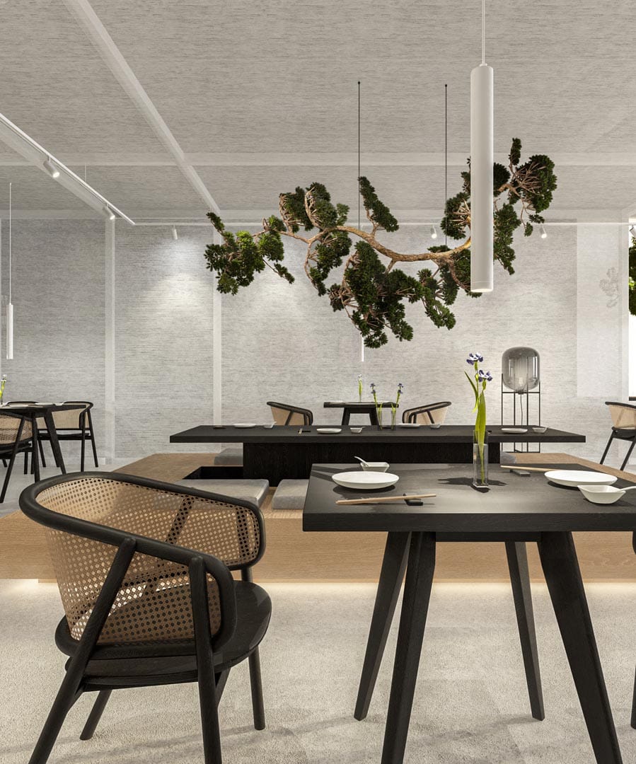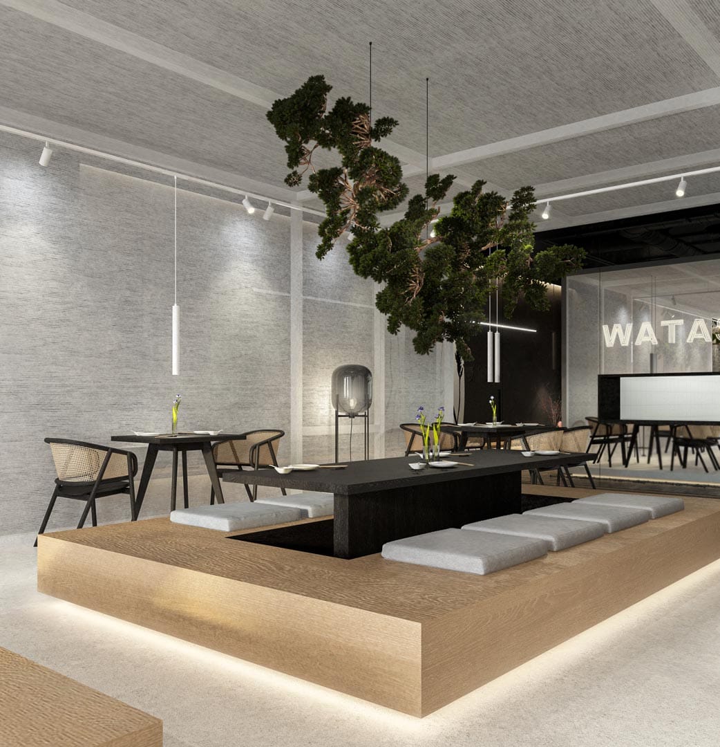 Watashi Wa sau Eu sunt, în limba japoneză este conceptul unui restaurant cu specific asiatic pe care îl propunem pentru amenajarea spațiului aflat la parterul clădirii de birouri Tandem din București.